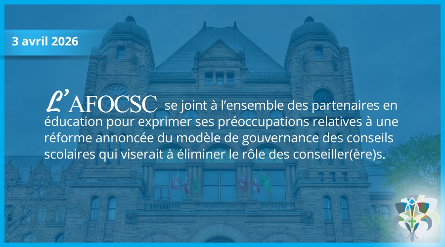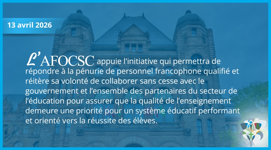 L’AFOCSC est dédié à être un partenaire d’influence pour la promotion de candidats francophones qualifiés et engagés à enseigner dans les conseils scolaires catholiques en français dans la province de l’Ontario.